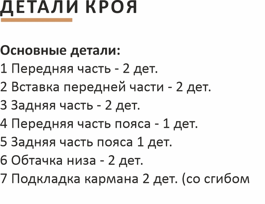 РАСКРОЙ и ПОШИВ: раскроите детали из основного материала. Контуры деталей уже содержат припуски на швы и обработку. Величины припусков смотрите на деталях выкройки.