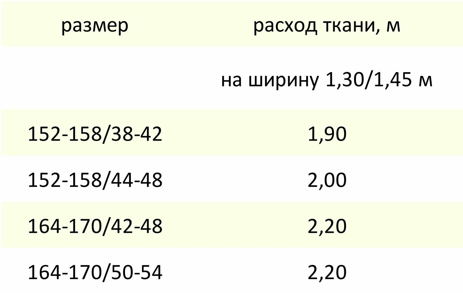 Минимальный расход материала представлен в таблице. К модели прилагается "Последовательность пошива", в которой доступны схемы раскладок для нескольких вариантов раскроя.