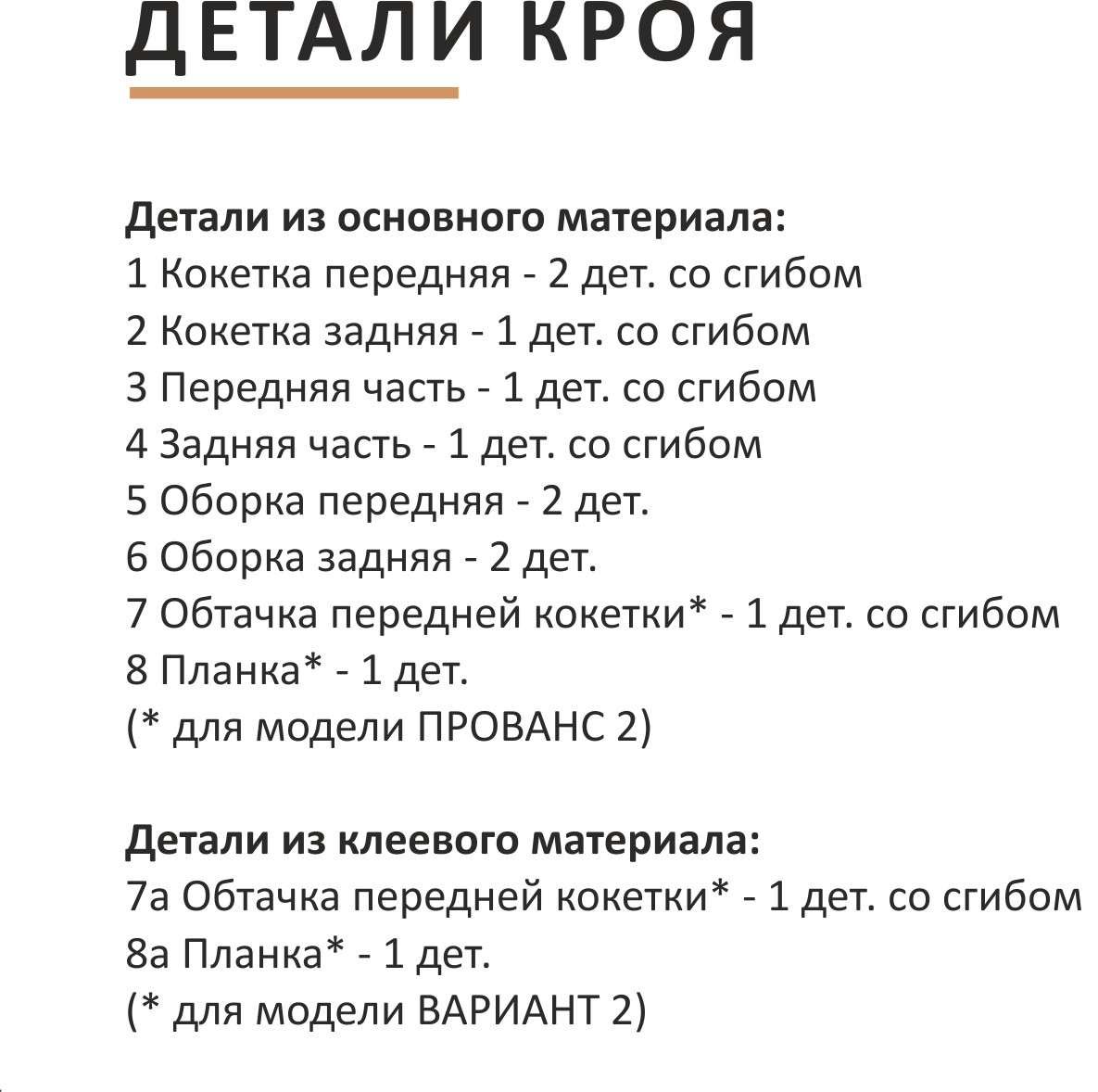 ВАРИАНТ 1: материал немного просвечивает из-за структуры или цвета, поэтому передняя кокетка кроится 2 дет.