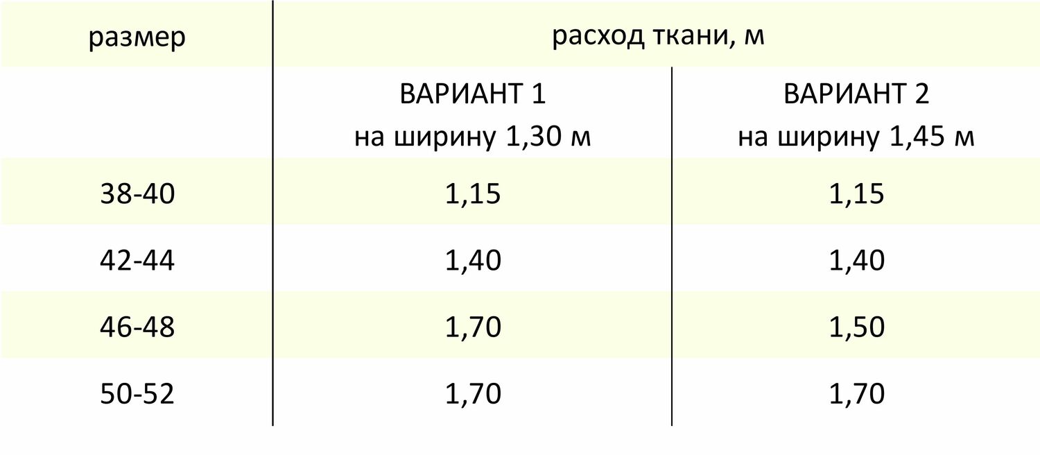 Минимальный расход материала представлен в таблице. К модели прилагается "Последовательность пошива", в которой доступны схемы раскладок.